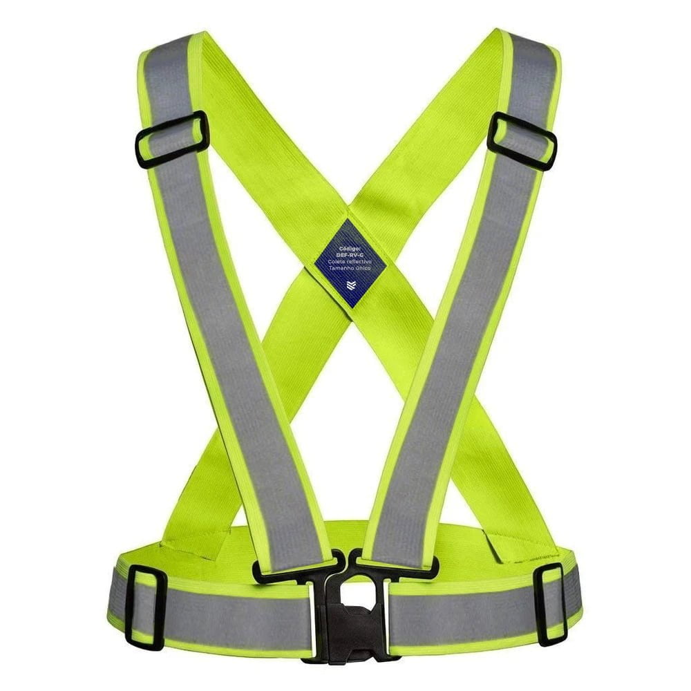 40mm elastic hi-viz strip with 30mm silver reflective tape. fully adjustable on shoulders and around waist